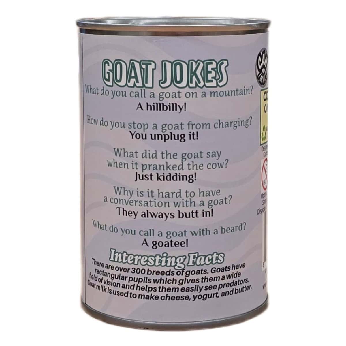 • Funny goat jokes and interesting facts on the can.