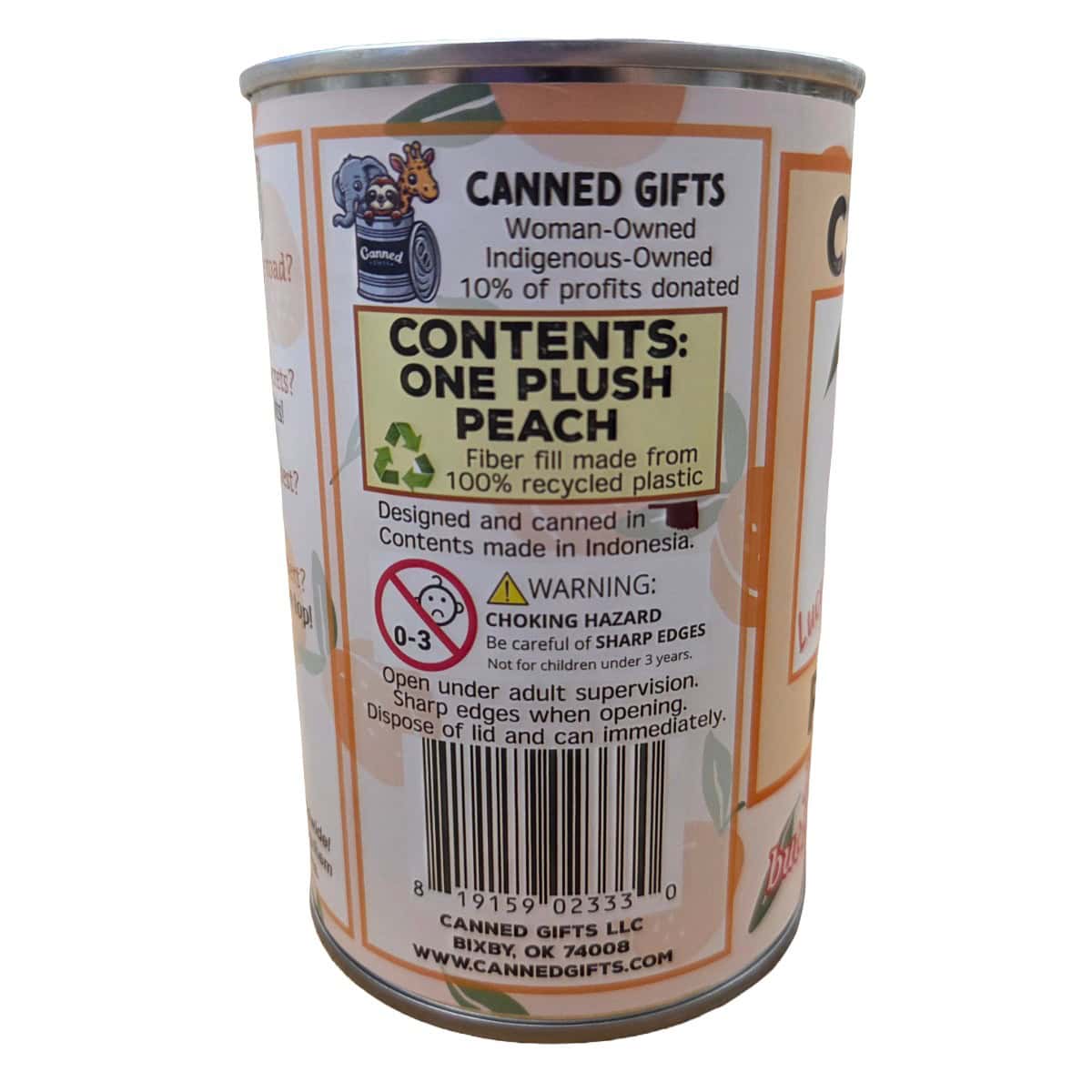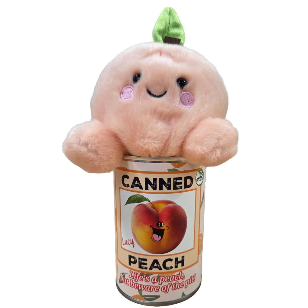 • Peach plush sealed in a can. Your choice of lid style: regular, pop top, or foil lid.