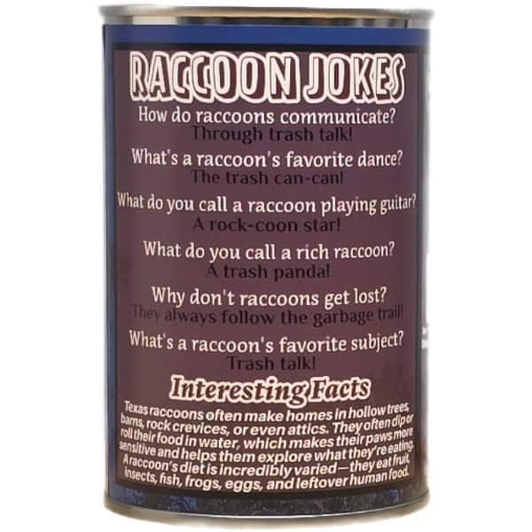 • Funny raccoon jokes and an interesting fact on the can.