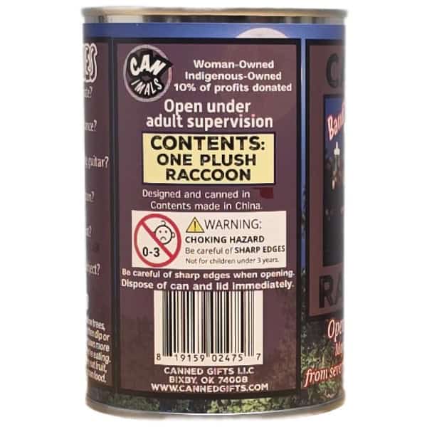 • Raccoon plush sealed in a can. Your choice of lid style: regular (which requires a can opener), pop top, or foil.