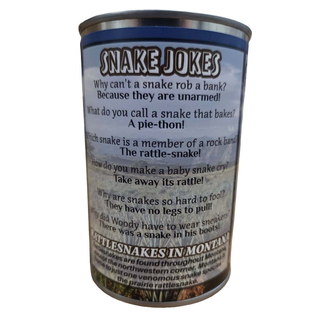 • Funny rattlesnake jokes and interesting facts about the Montana Rattlesnake on the can.