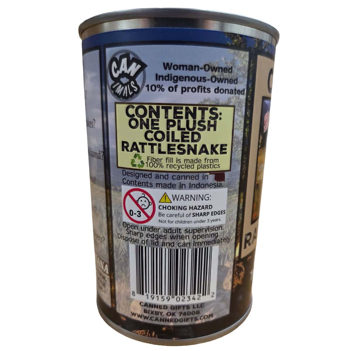 • Plush coiled rattlesnake sealed in a can. Your choice of lid style: regular, pop top, or foil.