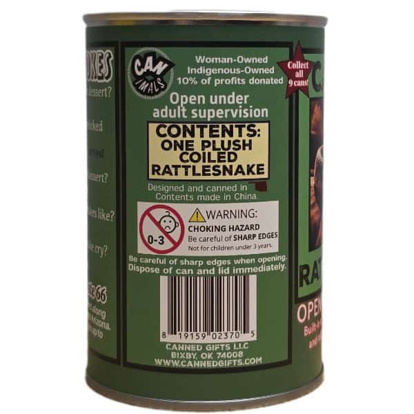 • Rattlesnake coiled plush sealed in a can. Your choice of lid style: standard (open with a can opener), pop top, or foil.