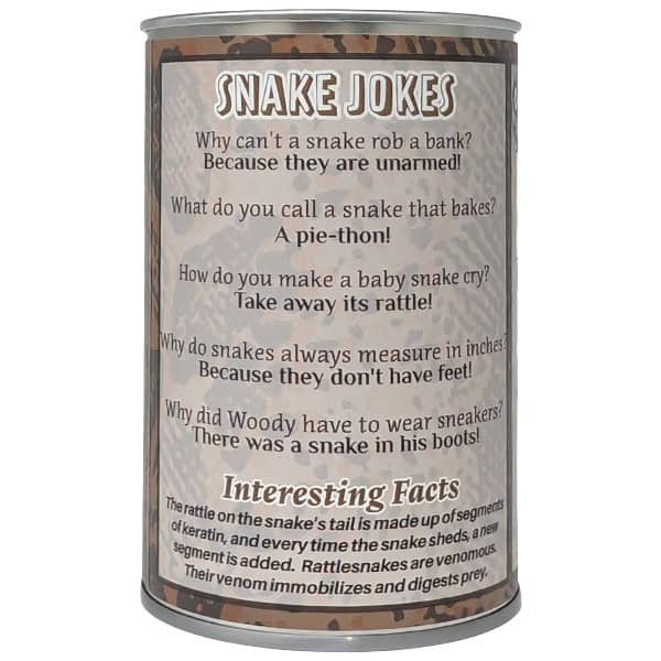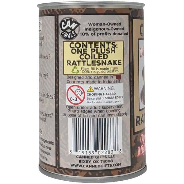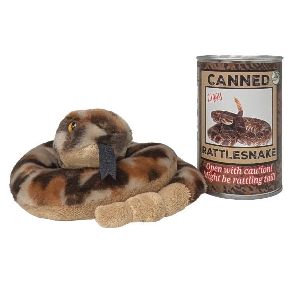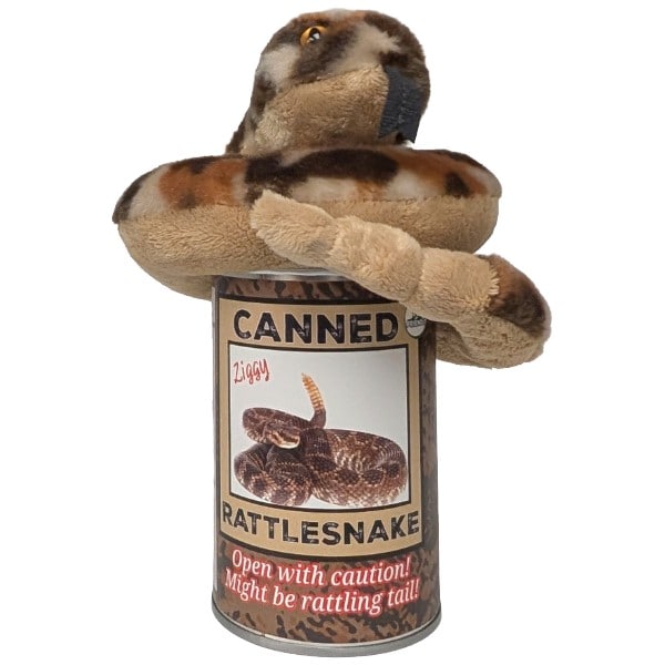• Rattlesnake plush sealed in a can. Your choice of lid style: regular (which requires a can opener), pop top, or foil.