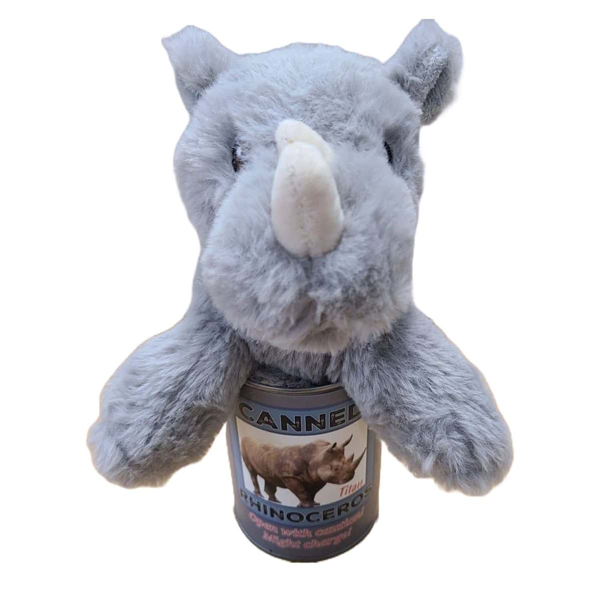 • Rhinoceros plush sealed in a can. Use a can opener to open the fun gift or choose the pop top lid!