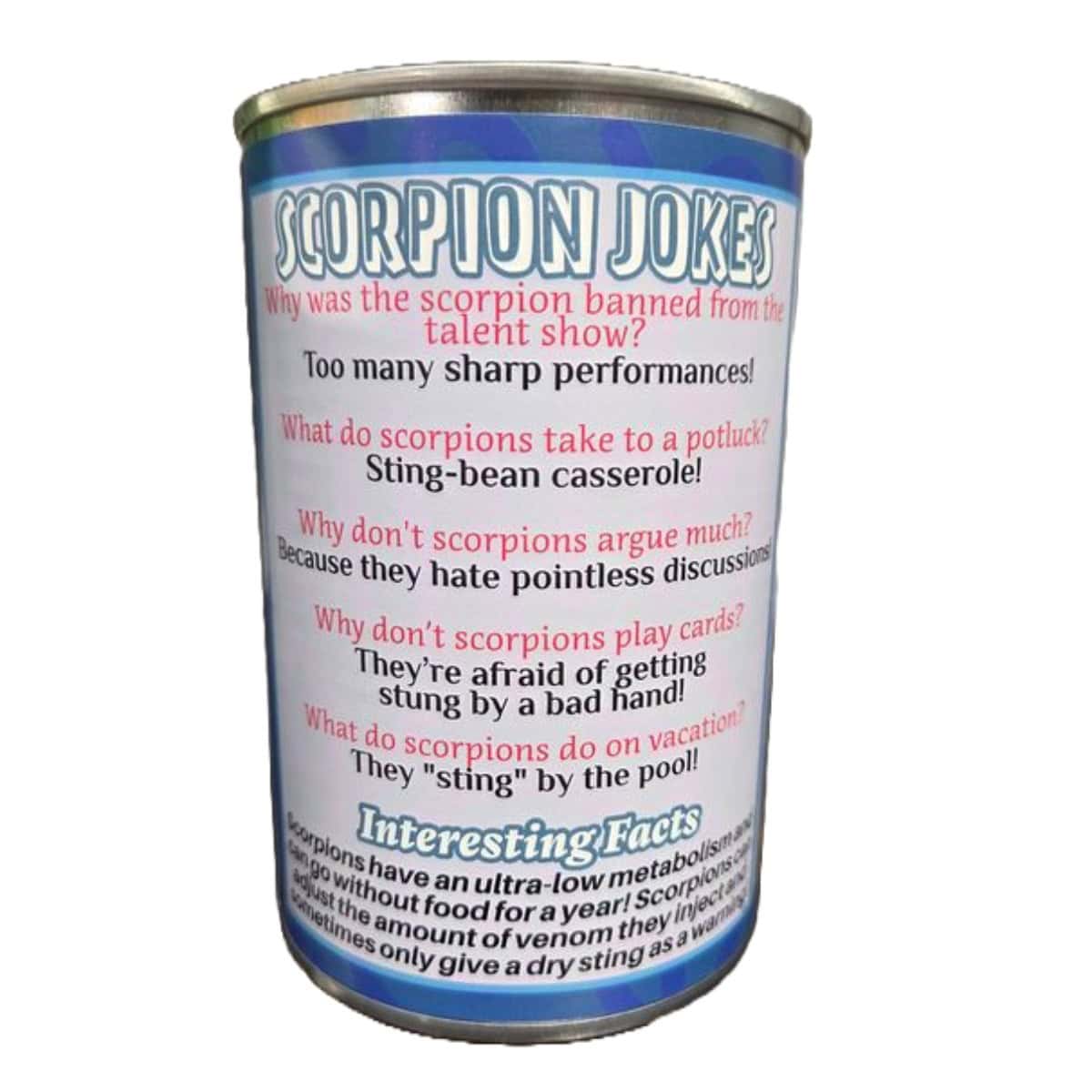 • Funny scorpion jokes and interesting facts on the can.