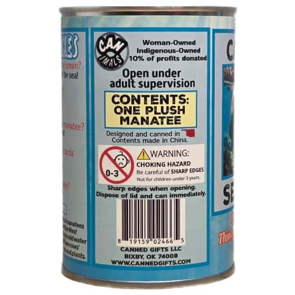 • Manatee plush sealed in a can. Your choice of lid style: regular, pop top, or foil lid.