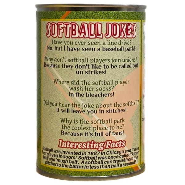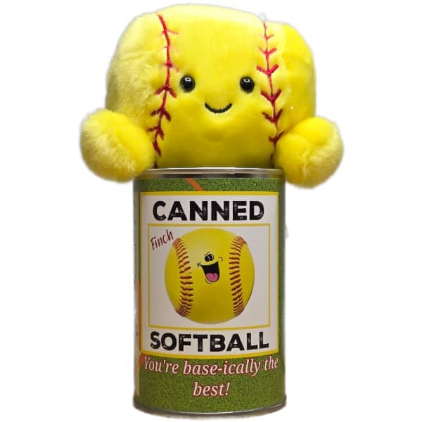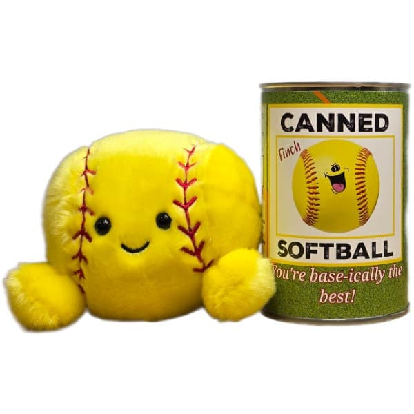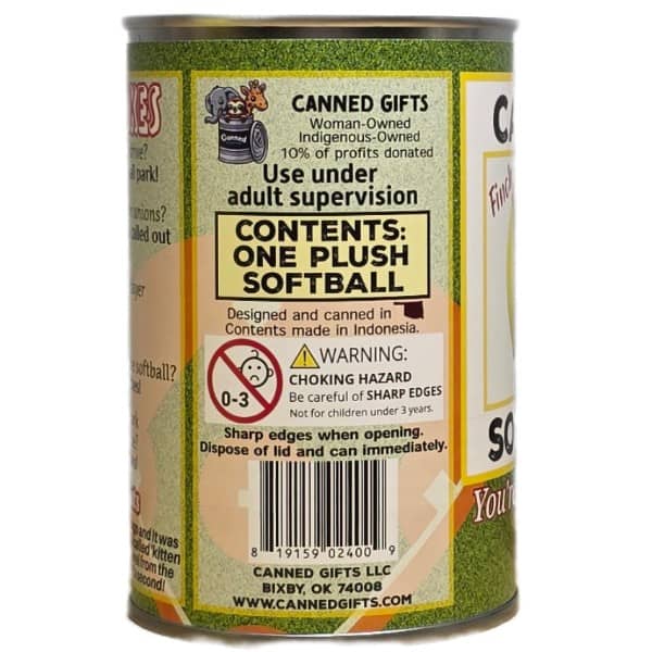 • Softball plush sealed in a can. Use a can opener to open the fun gift or choose the pop top lid!