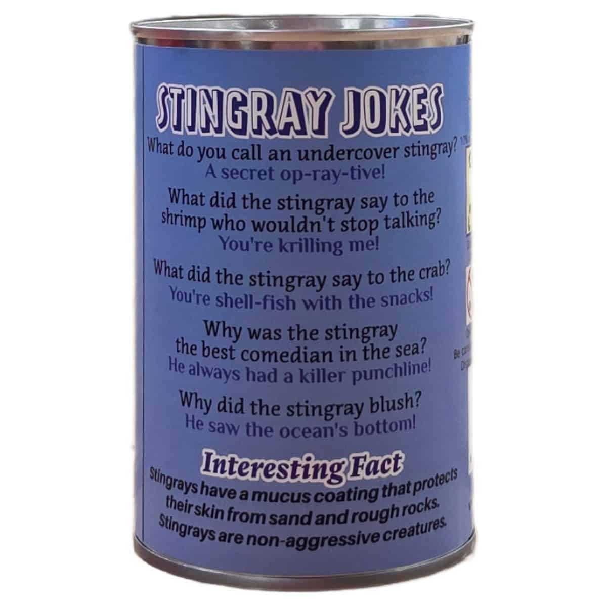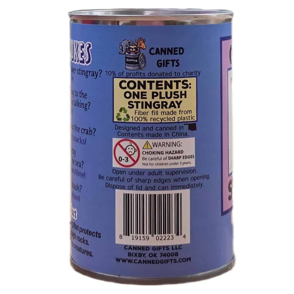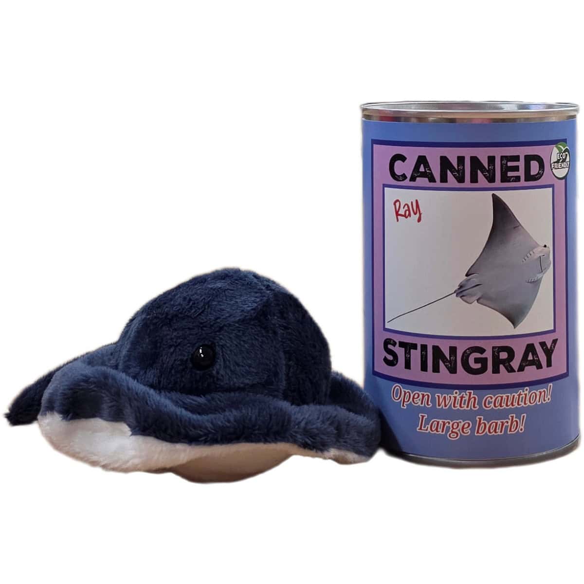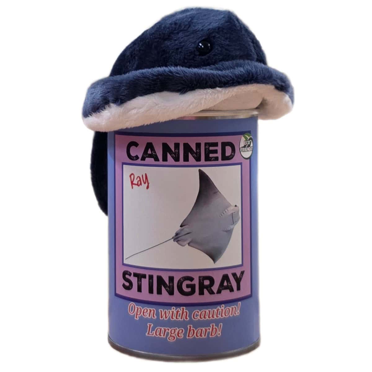 • Stingray plush sealed in a can. Use a can opener to open the fun gift or choose the pop top lid!