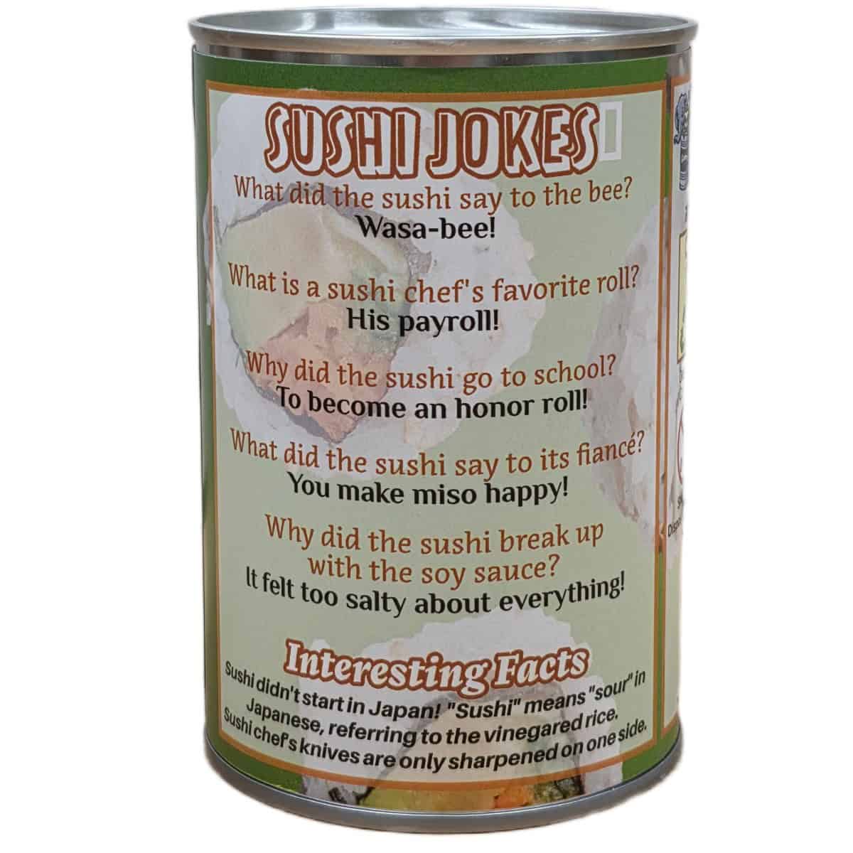 • Funny sushi jokes and interesting facts on the can.