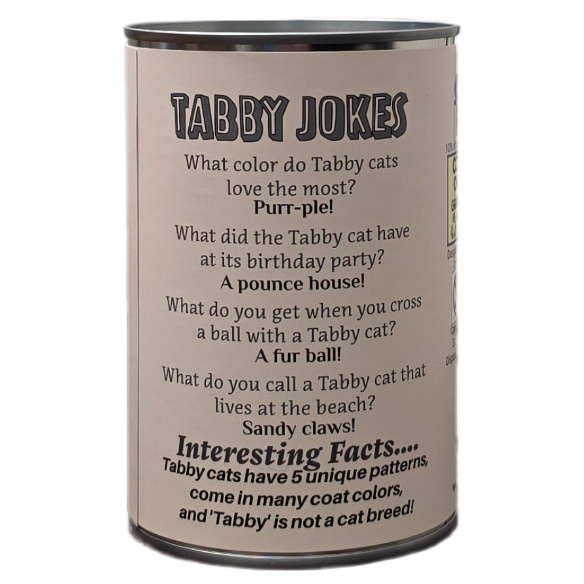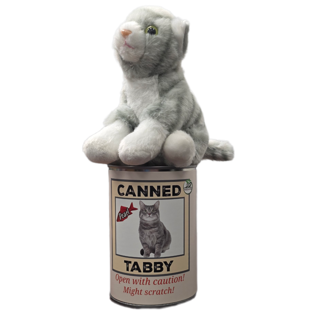 • Included is 1 plush gray tabby cat sealed in a can. Use a can opener to open the fun gift or choose a pop top lid
