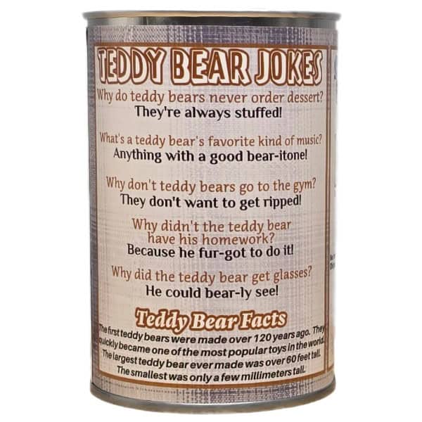 • Funny teddy bear jokes and an interesting fact on the can.