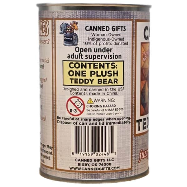 • Teddy bear plush (Brown) sealed in a can. Use a can opener to open the fun gift or choose the pop top lid!