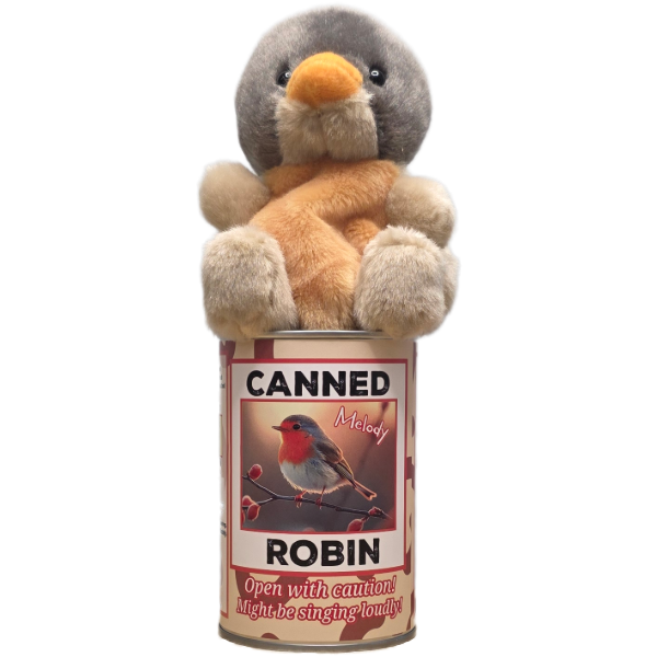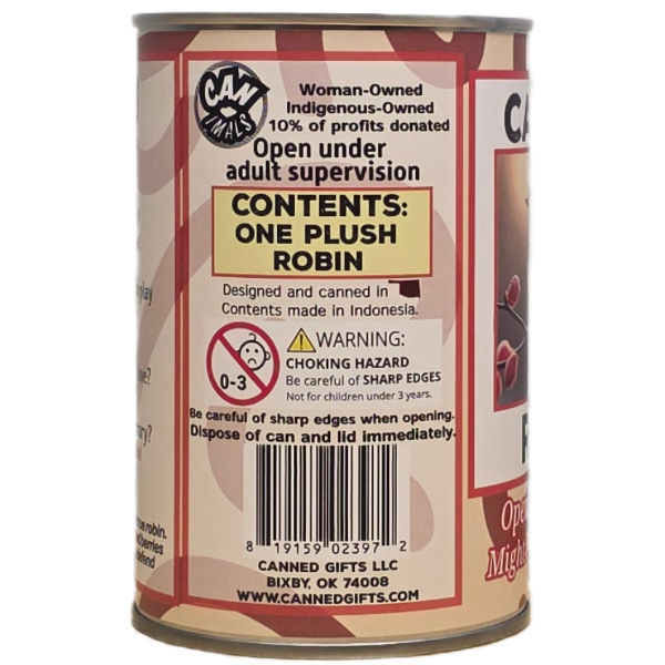 • Robin plush sealed in a can. Your choice of lid style: pop top, foil, or regular lid (open with a can opener)!