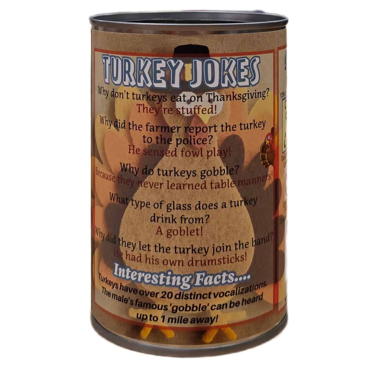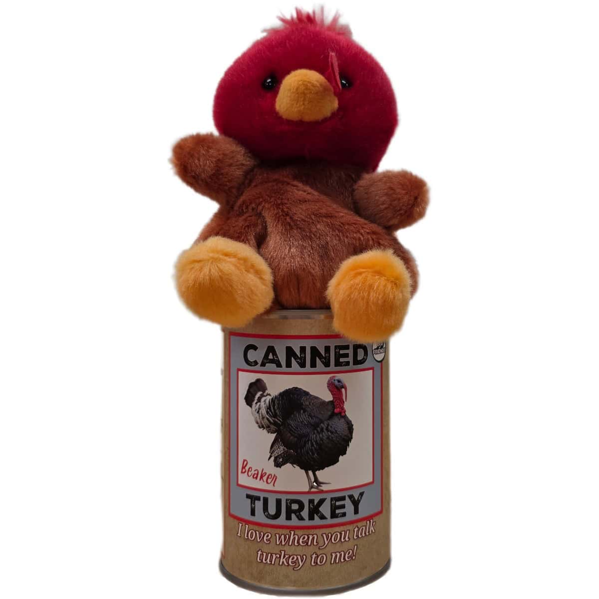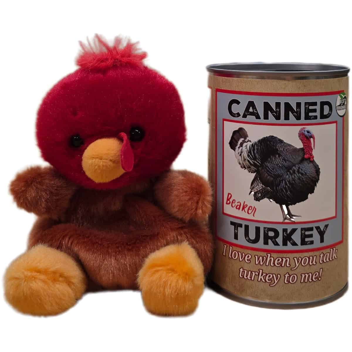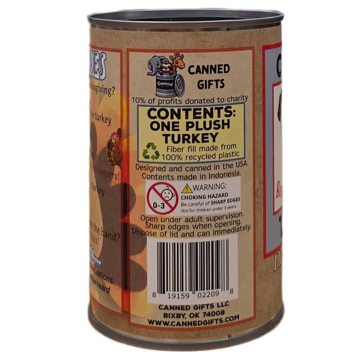 • Turkey plush sealed in a can. Your choice of lid style: standard, pop top, or foil lid.