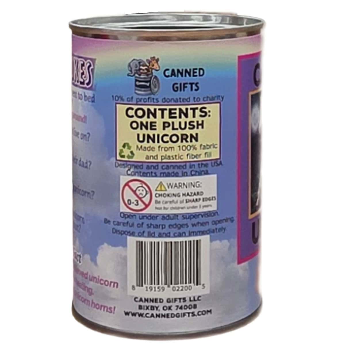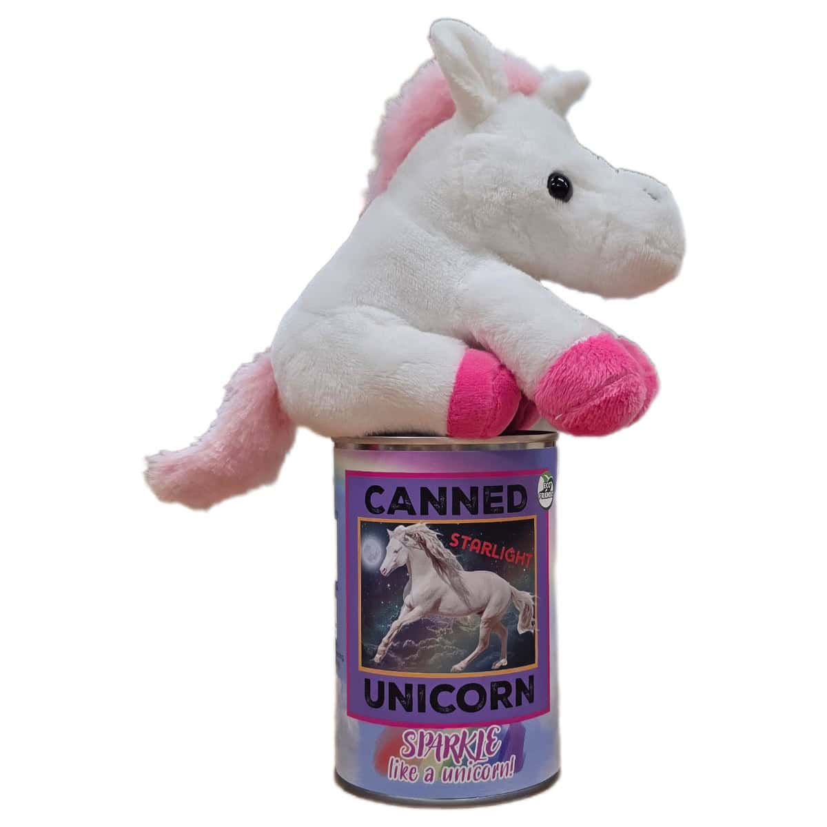 • Plush unicorn sealed in a can. Use a can opener to open the fun gift or choose a pop top lid!